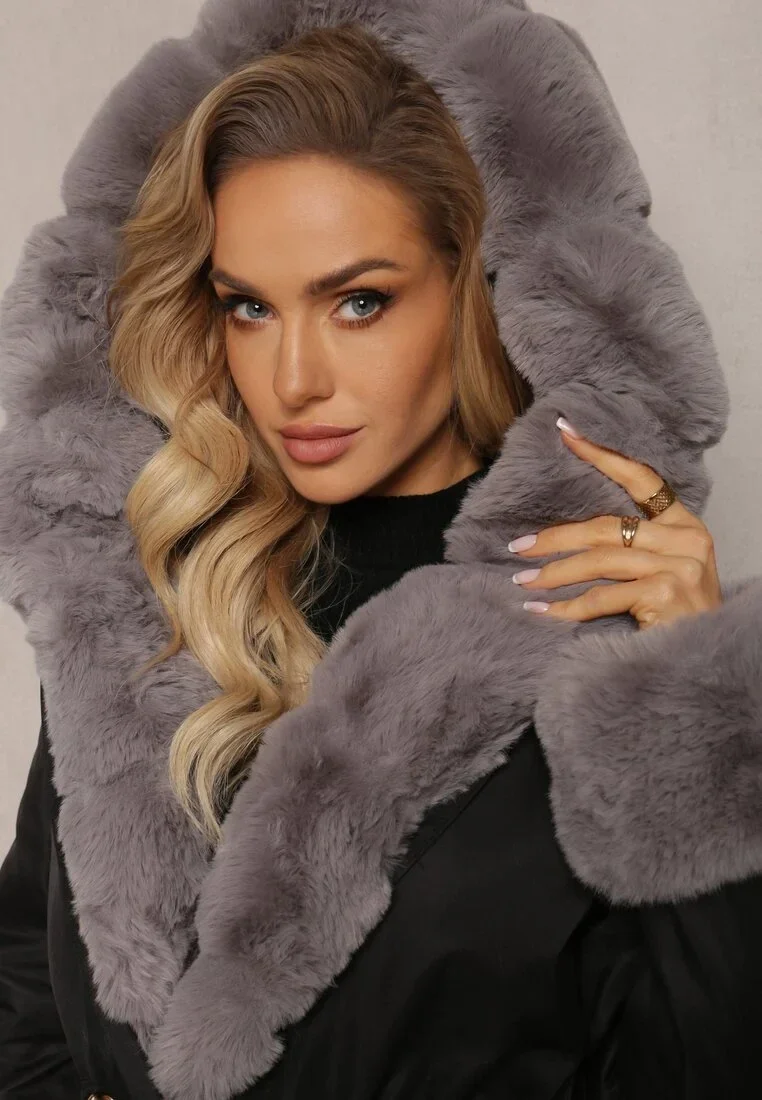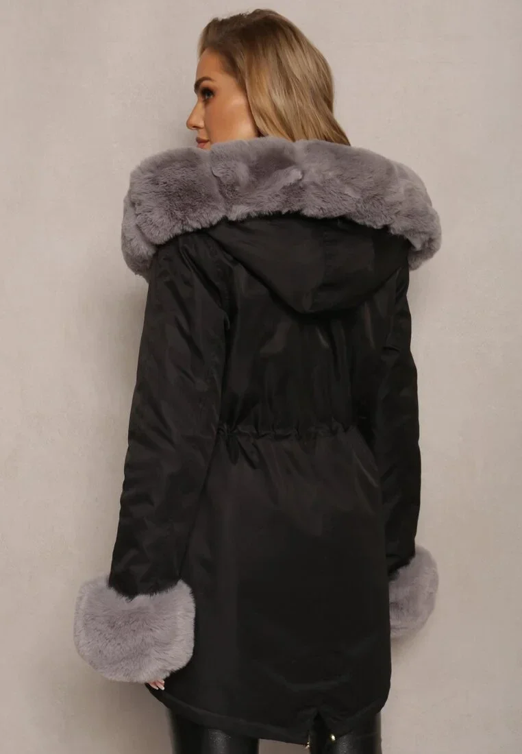 - Kurtka posiada odpinane ozdobne futerko z kapturka oraz wzdłuż suwaka