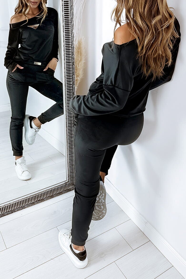 Welurowy komplet damski z wygodnymi spodniami na gumce to idealny wybór na co dzień. Luźna bluzka, którą możesz nosić odsłaniając ramię, łączy styl z komfortem. Złota naszywka na bluzie i spodniach dodaje całości eleganckiego charakteru.