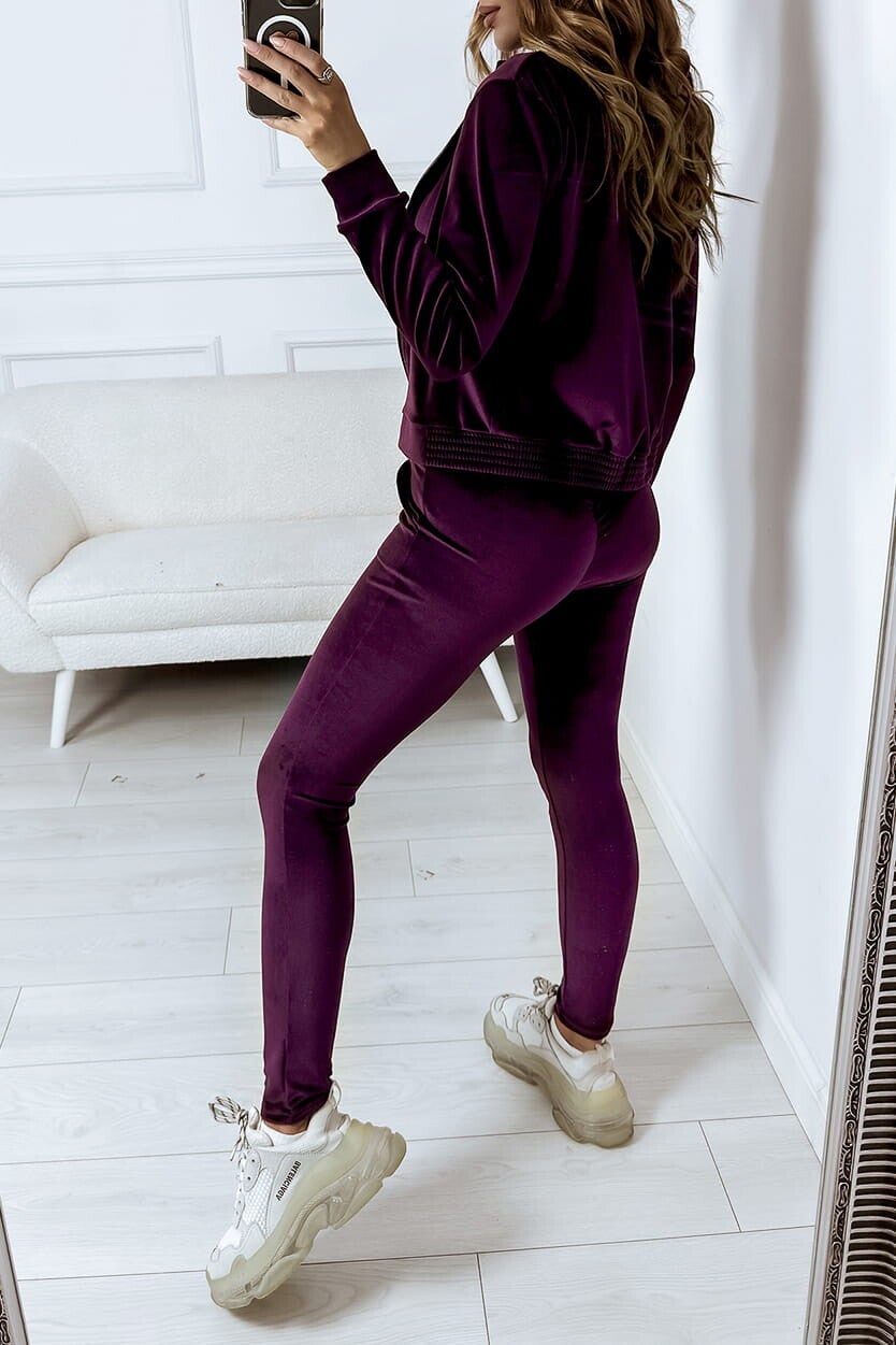 Trzyczęściowy dres welurowy to absolutny must have w Twojej szafie. Dostępny u nas model składa się z rozpinanej bluzy, dopasowanego topu na szerokich ramiączkach i legginsów z wysokim stanem. Welurowy komplet noś solo lub w zestawie! Złota naszywka doda stylizacji unikalny charakter.