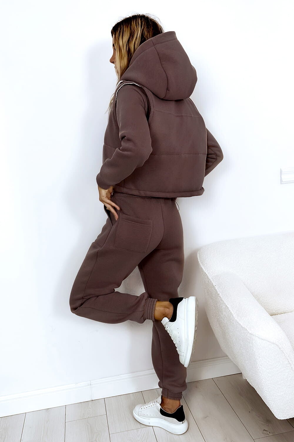 Gruby komplet dresowy składający się z długich spodni oraz wygodnej bluzy z kapturem i niebanalnego bezrękawnika. Bluza posiada elastyczną, nieuciskającą gumkę na dole. Spodnie dresowe z wysokim stanem. Komplet tworzy piękną całość, której nie może zabraknąć w Twojej szfie na sezon jesień/zima.