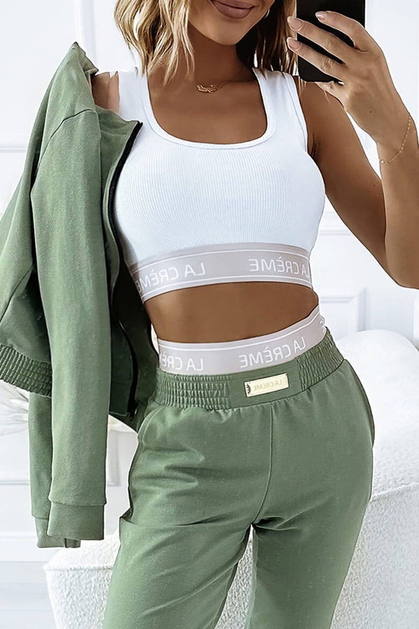 W szafie każdej kobiety powinien znaleźć się trzyczęściowy dres damski, który spisze się na co dzień. Komplet dresowy La Creme składa się z bluzy na zamek, topu i spodni. Krótka bluza i spodnie dresowe mają ozdobną taśmę, która pozwoli Ci podkręcić look.